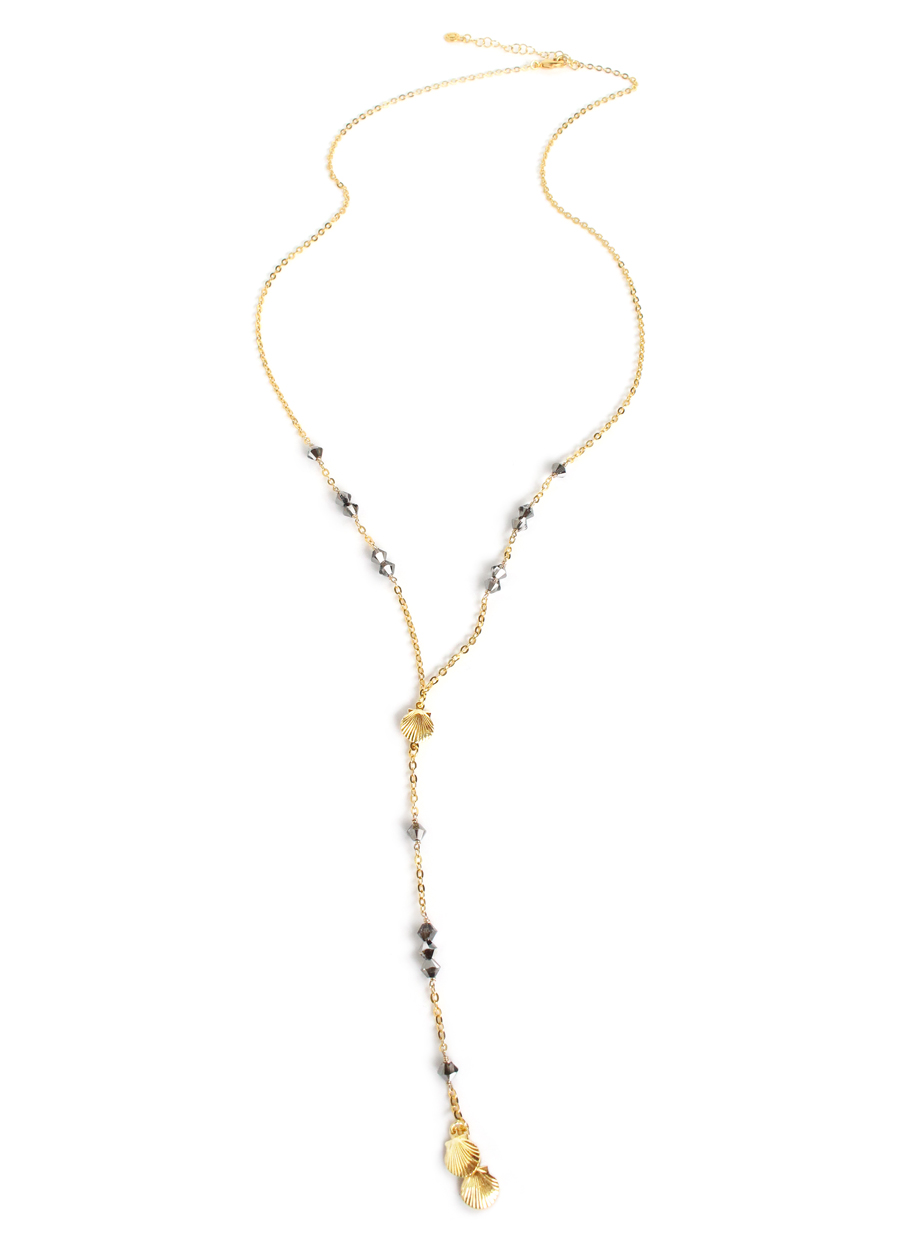 Diese 18-karätig vergoldete Y-Halskette mit Muschelanhänger und schwarzen Diamantkristallen verleiht jedem Alltagsoutfit einen eleganten Touch. Ihr Design ist so gestaltet, dass sie auffällt, ohne den restlichen Look zu dominieren. Je nach Anlass lässt sie sich sowohl zu schlichten Basics als auch zu eleganteren Outfits kombinieren. Dank ihres schlichten Designs ist sie vielseitig einsetzbar und passt zu verschiedenen Anlässen – ob im Büro, am Abend oder bei formellen Veranstaltungen. Die Proportionen sorgen für angenehmen Tragekomfort, auch über längere Zeit. Für einen schönen Lagenlook lässt sie sich wunderbar mit anderen Schmuckstücken kombinieren. Ihr Look harmoniert mit einer Vielzahl von Farben und Stoffen in einer modernen Garderobe. Mit der Zeit wird sie zu einem Ihrer Lieblingsaccessoires. Ob als Ergänzung Ihrer eigenen Schmucksammlung oder als Geschenk – diese Halskette ist eine stilvolle Wahl.